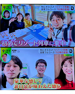 弊社代表 頼藤太希と取締役 高山一恵が「秋にオススメ「リゾート列車」豪華フルコース「52席の至福」」というコーナーで出演しました。(頼藤太希,高山一恵)